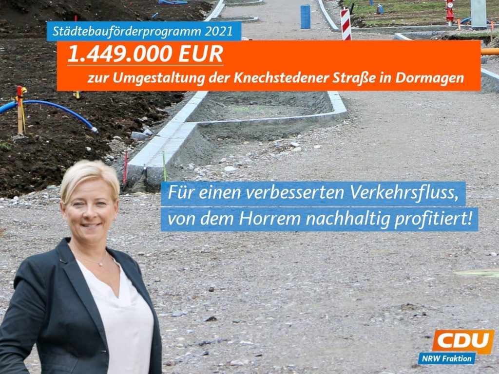 Die nordrhein-westfälische Landesregierung hat kürzlich das Städtebauförderprogramm 2021 bekanntgegeben. 294 Projekte der Stadtentwicklung und 60 Sportstätten (Neubau oder Sanierung) aus ganz Nordrhein-Westfalen erhalten insgesamt 368 Millionen Euro. Auch Dormagen profitiert davon, indem insgesamt rund 1.449.000 Millionen Euro für die Umgestaltung der Knechtstedener Straße bereitgestellt werden.