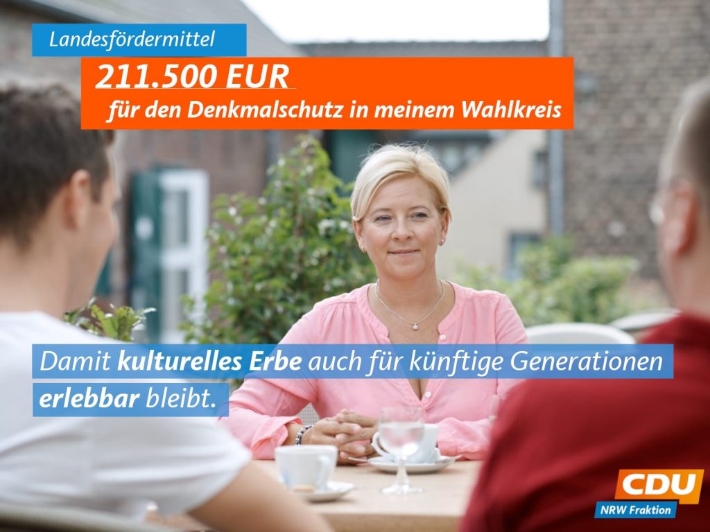 Es freut mich besonders, dass insgesamt 211.500 Euro Landesfördermittel für den Denkmalschutz nach Dormagen und Grevenbroich geleitet werden konnten. Die Mittel dienen dazu, die identitätsstiftenden Baudenkmäler vor Ort zu pflegen, um sie auch für nachkommende Generationen zu erhalten. Diese finanzielle Hilfe drückt zudem besondere Wertschätzung aus für alle Helfer, denn ohne die zahlreichen Privatpersonen, Vereine und Initiativen wäre dies alles nicht möglich.