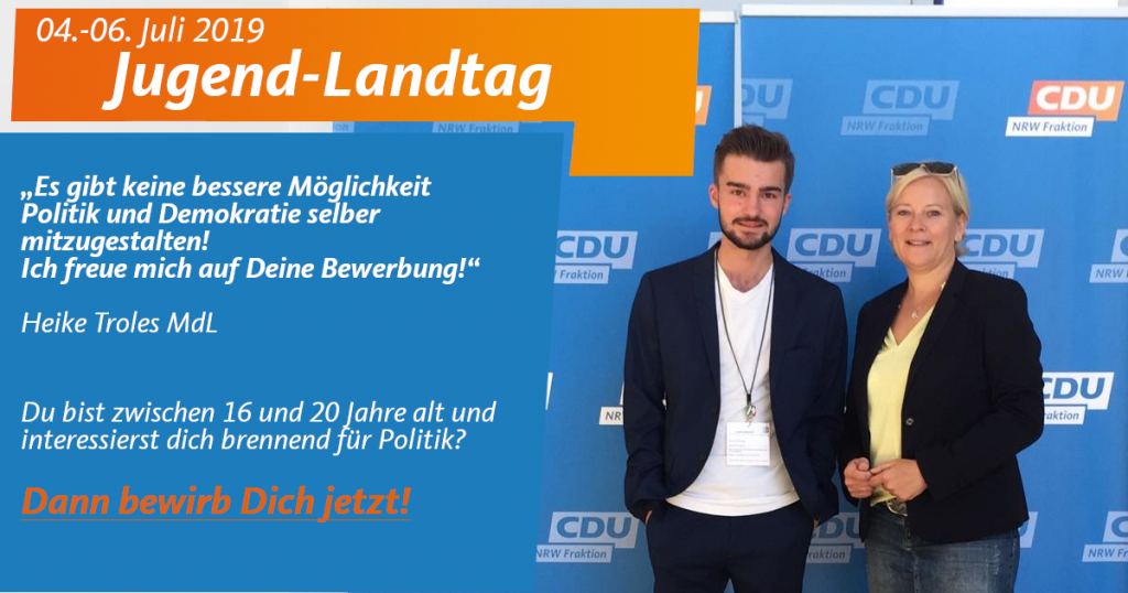 Vom 04. bis zum 06. Juli 2019 wird in der Landeshauptstadt Düsseldorf der nächste „Jugend-Landtag“ Nordrhein-Westfalen stattfinden. Der Landtag NRW möchte so Jugendlichen die Möglichkeit geben, Politik und Demokratie hautnah erleben zu können. Ein Jugendlicher im Alter zwischen 16 bis 20 Jahren kann mich dann im Parlament drei Tage lang „vertreten“. Sämtliche Kosten – auch Übernachtung und Verpflegung – werden vom Landtag übernommen (Fahrtkosten werden anteilig erstattet).