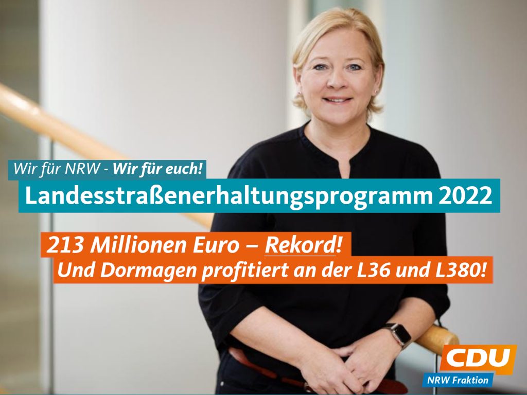Ich freue mich, dass auch wir in Dormagen davon profitieren. Für die Erhaltung unserer Landesstraßen, dazu zählt auch die Modernisierung von Geh- und Radwegen entlang der Landesstraßen, stehen in diesem Jahr rund 5,4 Millionen Euro zur Verfügung. Im Jahr 2022 werden damit die L36 Dormagen Straberg – Nievenheim sowie die L380 Neuss Allerheiligen – Dormagen Nievenheim saniert und die Geh- und Radwege modernisiert. In ganz Nordrhein-Westfalen wollen wir so rund 300 Kilometer an Straßen und Brückenbauwerken modernisieren.