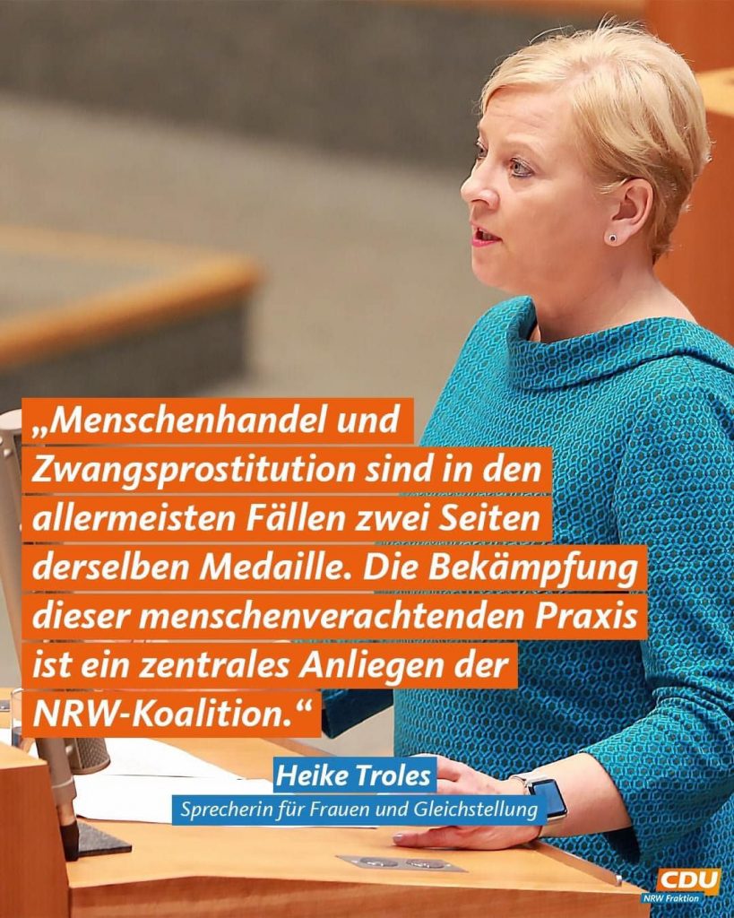 Dabei ist zu bedenken, dass Menschenhandel und Zwangsprostitution in den allermeisten Fällen zwei Seiten derselben Medaille sind. Die Bekämpfung dieser menschenverachtenden Praxis ist ein zentrales Anliegen der NRW-Koalition und der Landesregierung. Deshalb hat Gleichstellungsministerin Ina Scharrenbach am Montag, dem 19. Oktober 2020 die Aktion „EXIT.NRW“ vorgestellt. „EXIT.NRW“ hilft dabei, dass Thema weiter in die Öffentlichkeit zu tragen und Betroffene auf Hilfsangebote hinzuweisen.