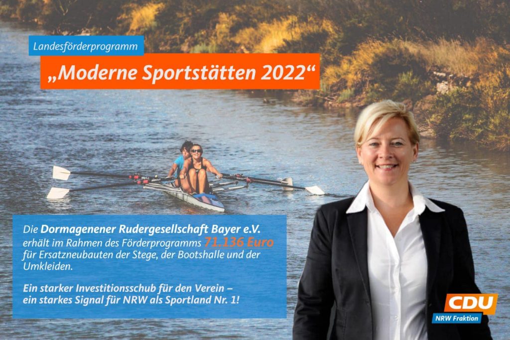 Ich freue mich sehr, dass die Dormagener Ruder-Gesellschaft Bayer e.V. damit nun die Möglichkeit hat, eine moderne und bedarfsgerechte Sportstätte anzubieten. Nachdem in den vergangenen Legislaturperioden unter Rot-Grün die Investitionen in unsere Sportstätten gestockt haben, hat die Landesregierung mit dem Sportstättenförderprogramm ein deutliches Zeichen gesetzt und stärkt so NRW weiterhin als Sportland Nummer 1.