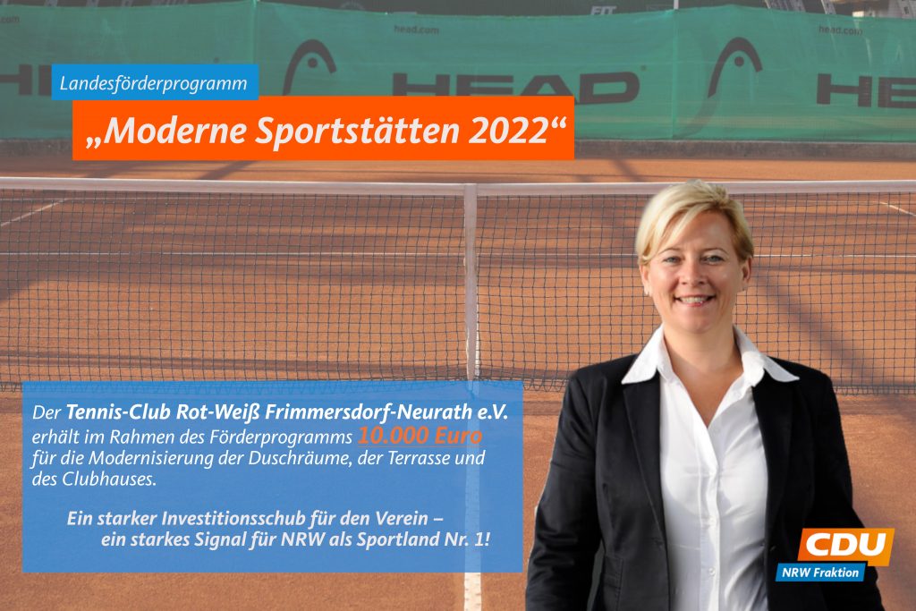 Gute Nachrichten für alle Sportlerinnen und Sportler des Tennis-Clubs Rot-Weiß Frimmersdorf-Neurath e.V. in Grevenbroich. In der ersten Förderrunde des Sportstättenförderprogramm „Moderne Sportstätte 2022“ erhalten sie insgesamt 10.000 Euro für die Modernisierung der Duschräume, der Terrasse und des Clubhauses. Mit dem Förderbescheid können die Verantwortlichen des Tennis-Clubs Rot-Weiß Frimmersdorf-Neurath e.V. mit den Arbeiten beginnen.