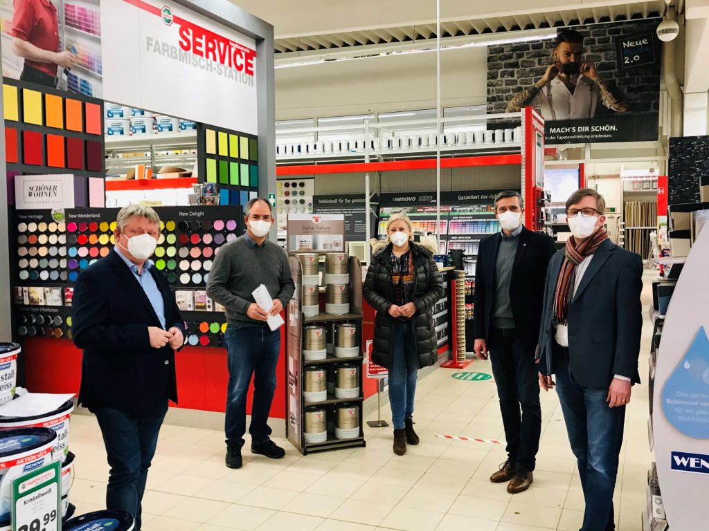 Aktuell ist der Einzelhandel deutschlandweit aufgrund der Maßnahmen zur Eindämmung des Corona-Virus geschlossen. Bund und Länder einigten sich indessen am 10. Februar 2021 darauf, auf Grundlage einer stabilen 7-Tage-Inzidenz von höchstens 35 Neuinfektionen pro 100.000 Einwohnerinnen und Einwohner den nächsten Öffnungsschritt anzugehen. Dieser soll unter anderem die Möglichkeit der Öffnung des Einzelhandels mit einer Begrenzung von einer Kundin oder einem Kunden pro 20 qm umfassen. Die Sicherstellung von verantwortungsvollen Hygiene- und Infektionsschutzkonzepten für den Fall einer Öffnung ist daher wichtig und sinnvoll. Darüber wie solche Konzepte aussehen können, informierten sich am 17.02.2021 der Bundestagsabgeordnete Hermann Gröhe und ich vor Ort beim hagebaumarkt in Dormagen. Gemeinsam mit Herrn Dahmen-Herburger, Geschäftsführender Gesellschafter hagebaumärkte quintus GmbH & Co. KG, Herrn Thomas Müller, Geschäftsführer quinuts GmbH & Co. KG, Herrn Maik Hohmann, Marktleiter hagebaumarkt Dormagen und Herrn Michael Cordes, Vertreter der hagebaugruppe Soltau, fand ein Austausch über die aktuelle Situation des Einzelhandels und mögliche Öffnungsschritte statt.